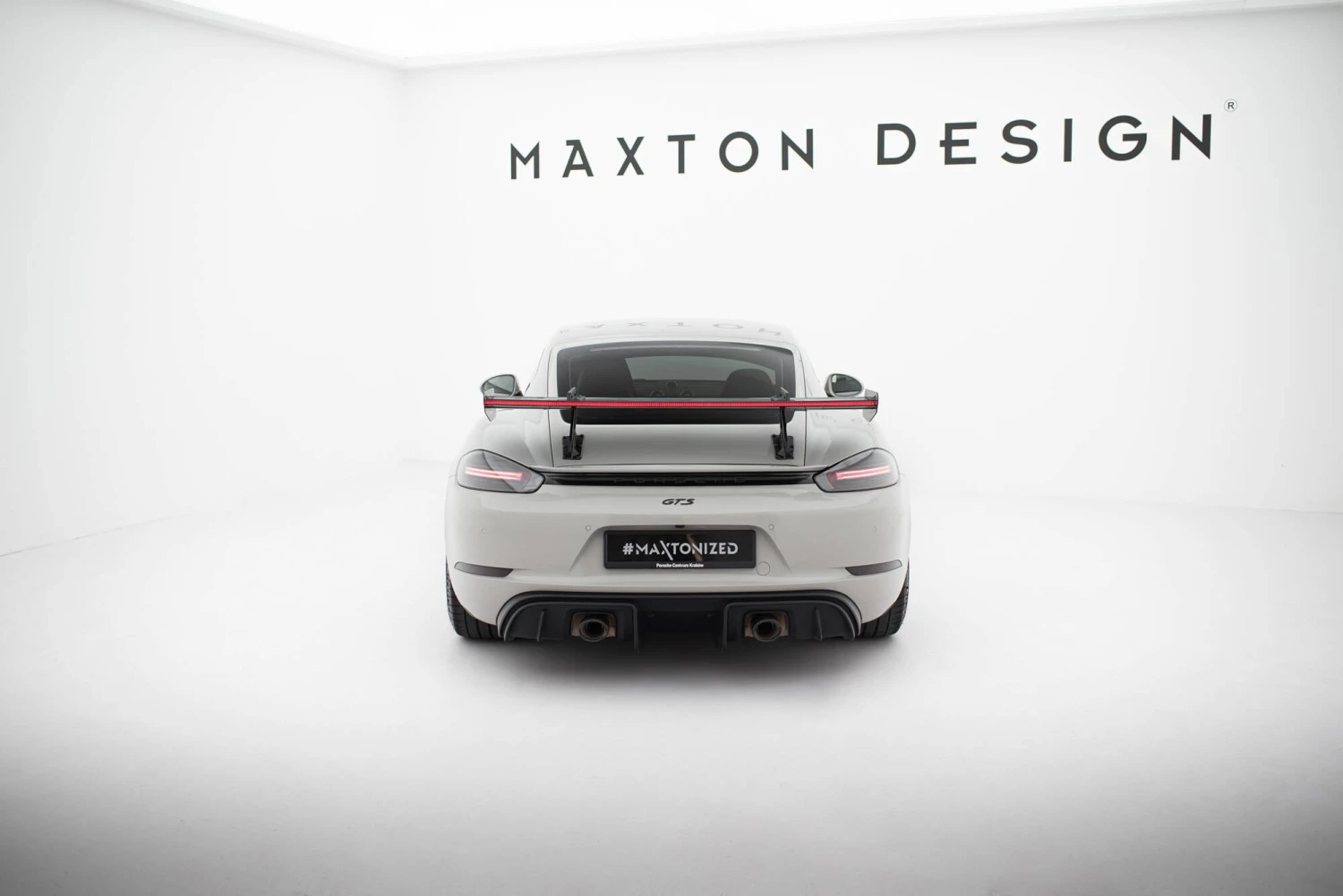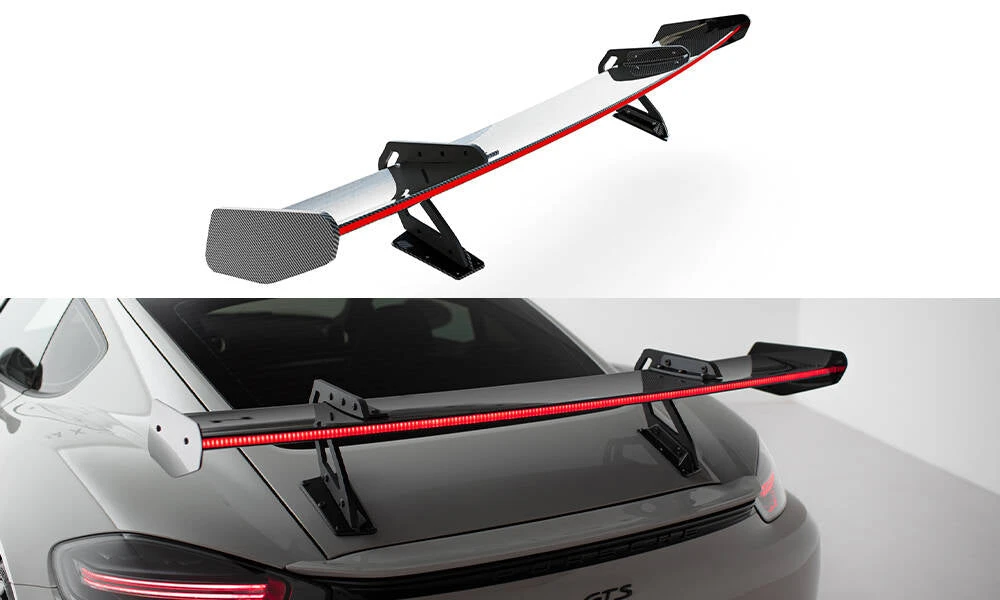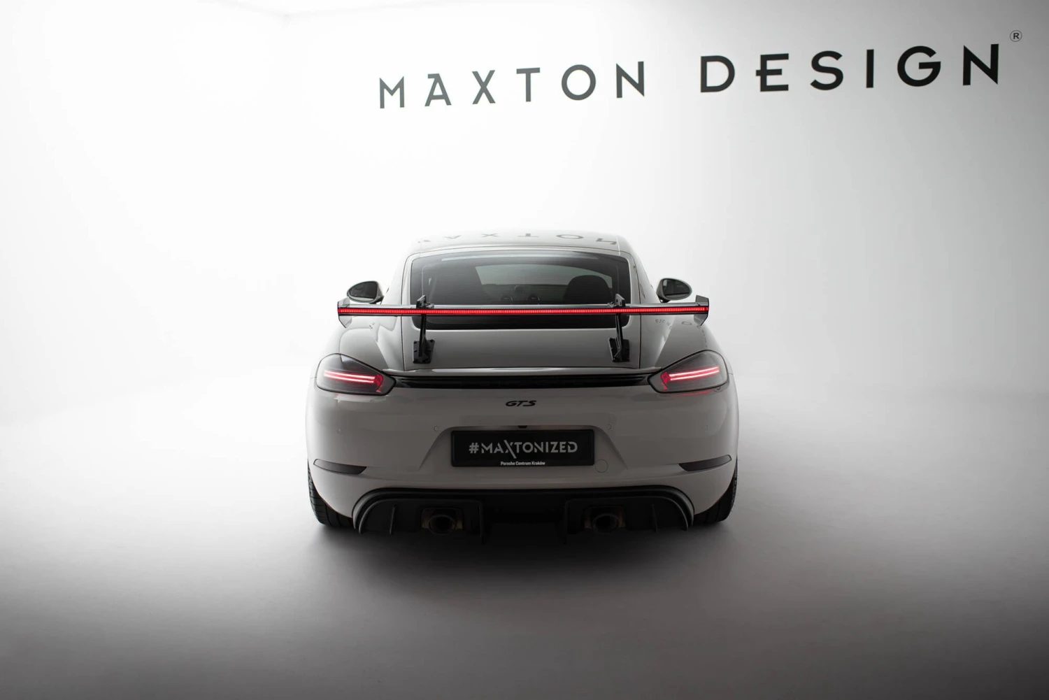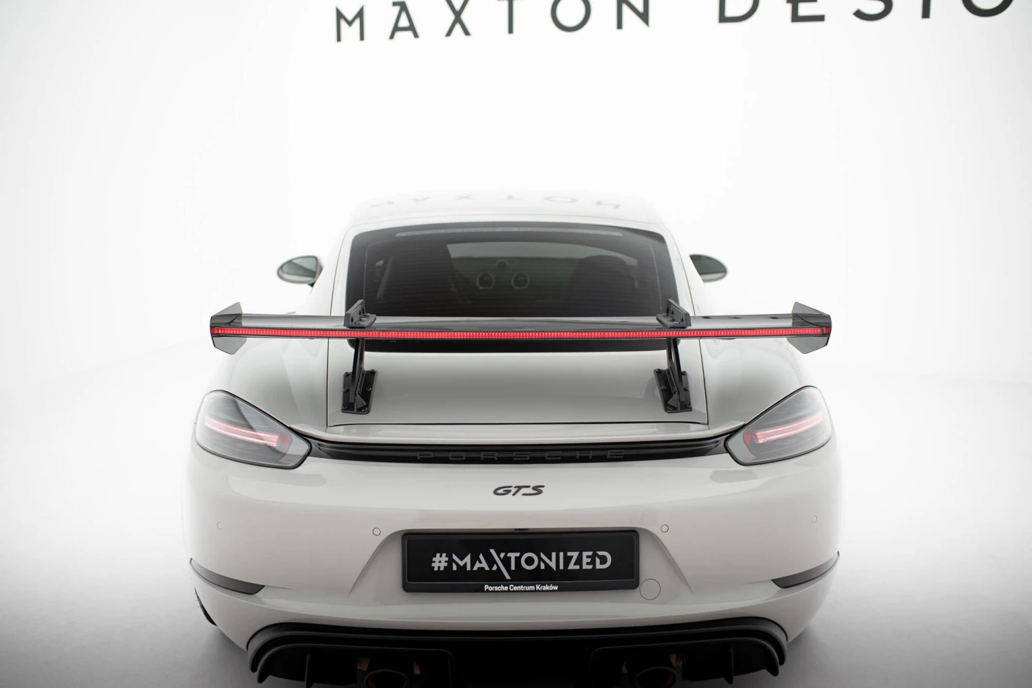 Stand out with this incredible Maxton Design Carbon Fiber Rear Wing with Upper Swan Mounting V.1 + LED for your Porsche 718 Cayman 982C. (Years: 2016 – Present)